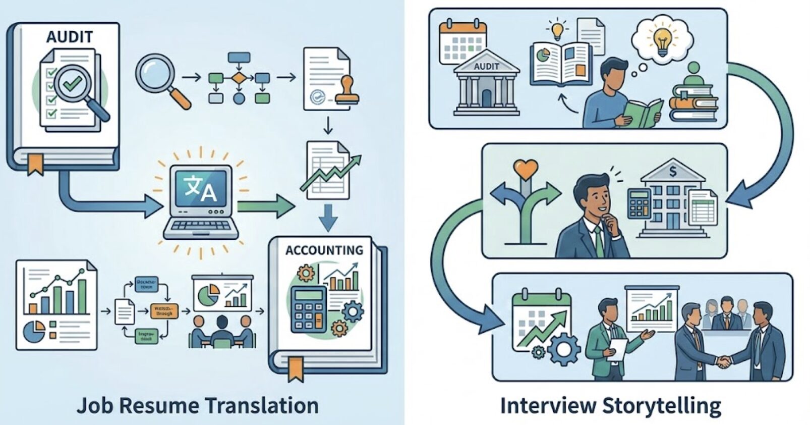 「監査から逃げた」ではなく「経理という仕事に引き寄せられた」というストーリーを作ることが、面接突破のカギになります。